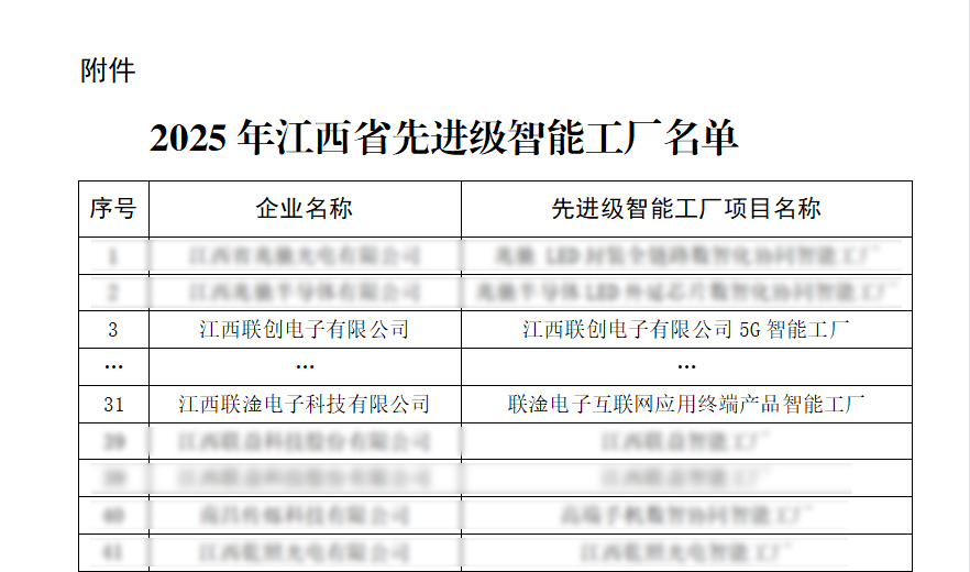 近日,江西省工业和信息化厅正式公布2025年江西省“先进级智能工厂”名单,186家企业入选。其中星空体育(StarSky Sports)官方网站,星空竞技体育引领者、江西联淦电子科技有限公司2家联创电子系企业名列榜单。这标志着公司在智能制造领域的创新成果再次获得政府权威认可。